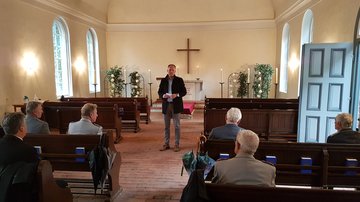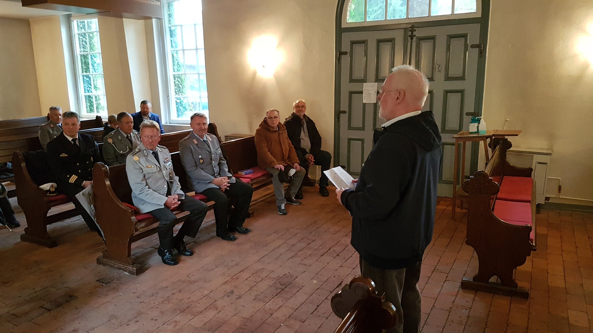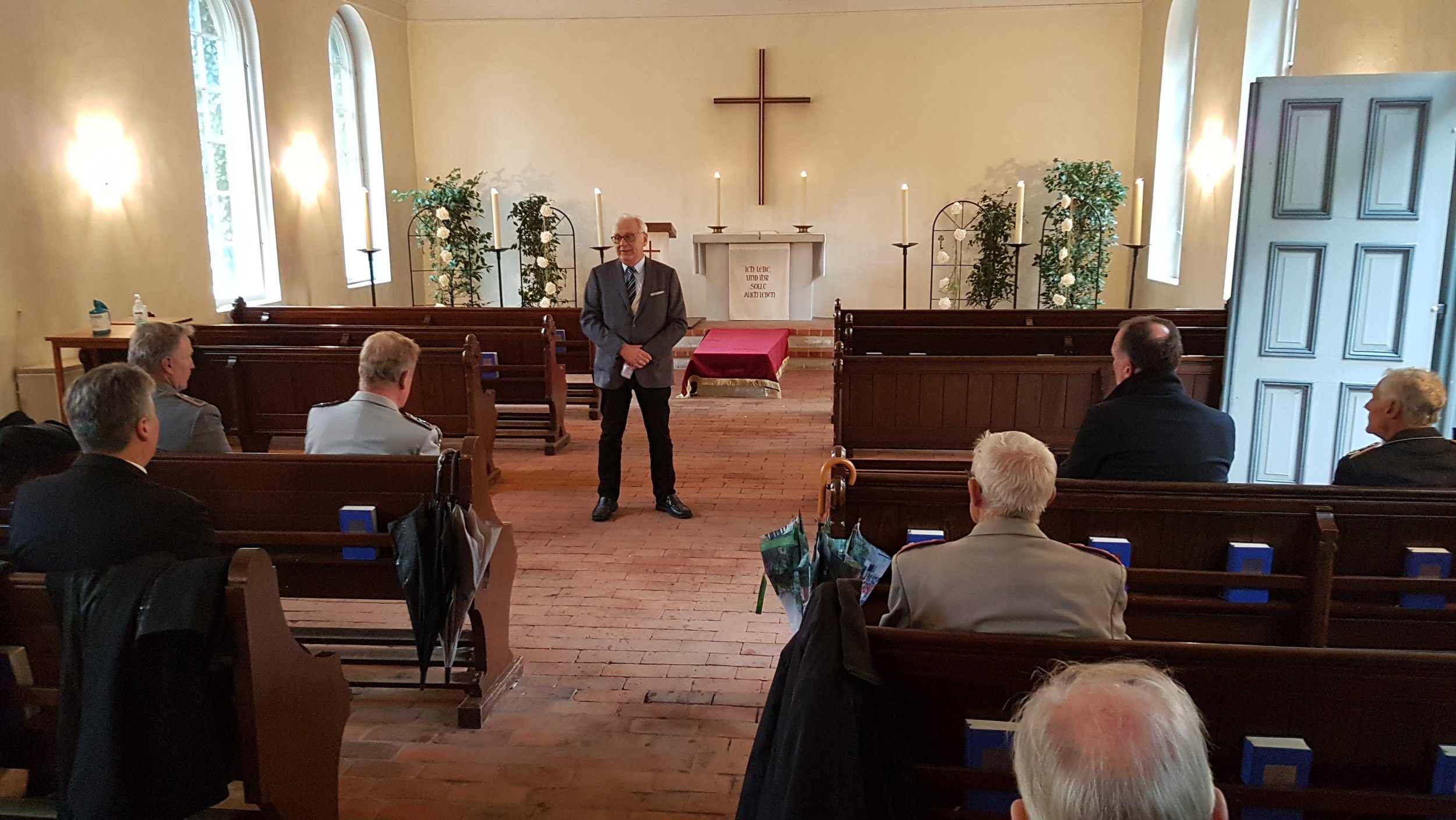 Aufgrund des schlechten Wetters wurden die Ansprachen der Gäste kurzfristig in die Kapelle verlegt. Bürgermeister Björn Demmin würdigte dabei die Leistungen und das Engagement der Preetzer Reservisten, nicht nur in Bezug auf die Patenschaft für den Historischen Gedenkstein. Gerade in der heutigen Zeit ist die Mahnung zum Frieden aktueller denn je, die Schrecken des Krieges sind zurückgekehrt nach Europa.