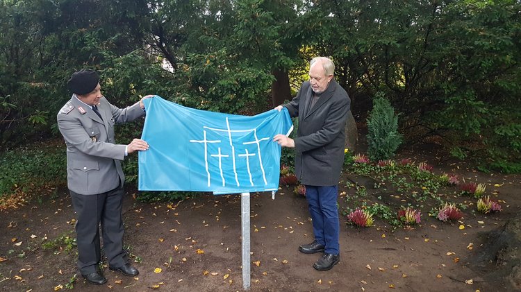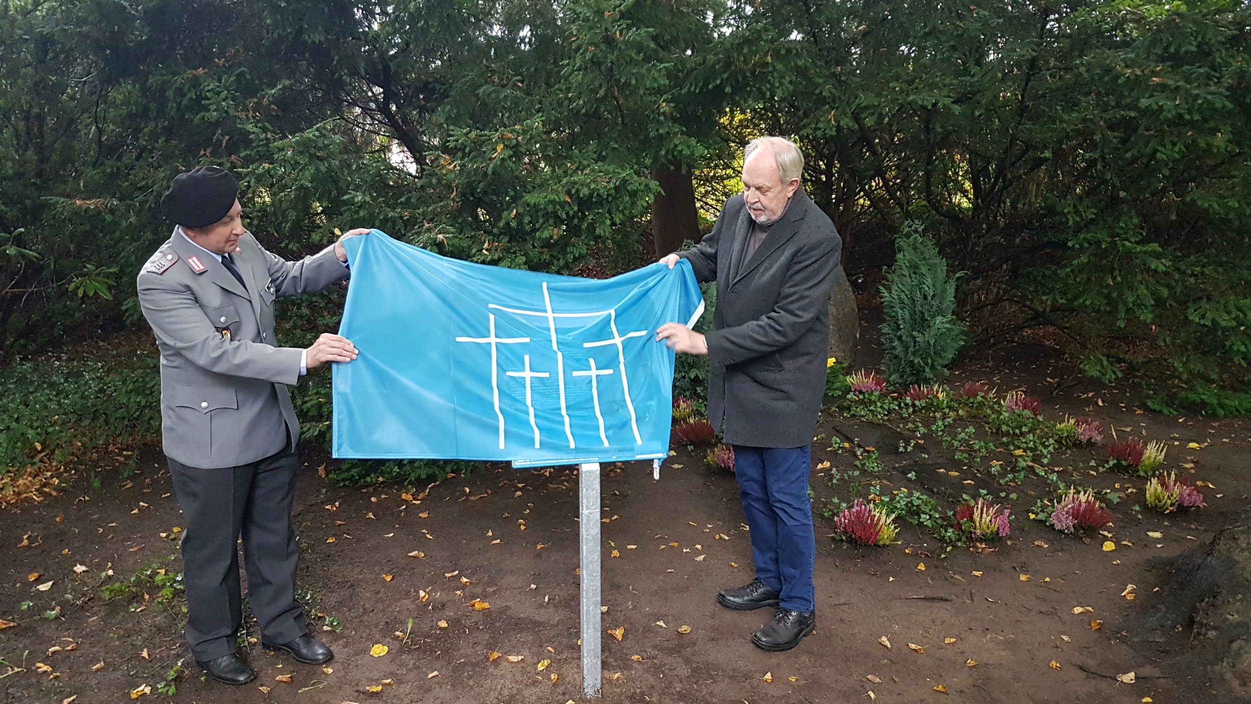 Herr Pauselius und der Hauptgefreite d.R. Achim Caspar, der sich regelmäßig um die Grabanlage kümmert und diese auch vor der Veranstaltung noch mal "aufgefrischt" und auch das Schild montiert hatte, sollten dann auch diejenigen sein, die die neue Hinweistafel enthüllen.
