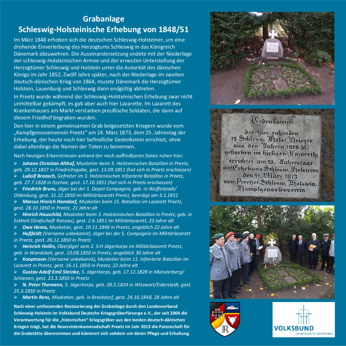 Schon seit 2013 betreut die Reservistenkameradschaft Preetz im Auftrag des Volksbundes eine historische Grabstätte auf dem Preetzer Friedhof. Hier wird an 13 Soldaten aus dem deutsch-dänischen Krieg erinnert, die 1864 im Lazarett in Preetz starben und auf dem Friedhof beigesetzt wurden. Mit Übernahme der Patenschaft wurde seinerzeit eine Informationstafel angebracht, die über die Hintergründe des Geschehens und die Betreuung der Anlage durch die Reservisten informiert.