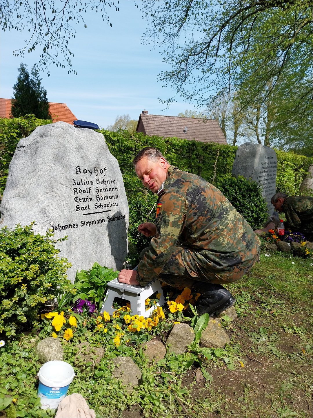 Gemeinsam mit dem Friedhofsverwalter Mirco Ralff wurde der erste Einsatz im Frühjahr in Angriff genommen. Die Vorarbeiten, die Reinigung der Gedenksteine auf dem Friedhof, übernahm der Stabsunteroffizier d.R. Mario Mühlhan.